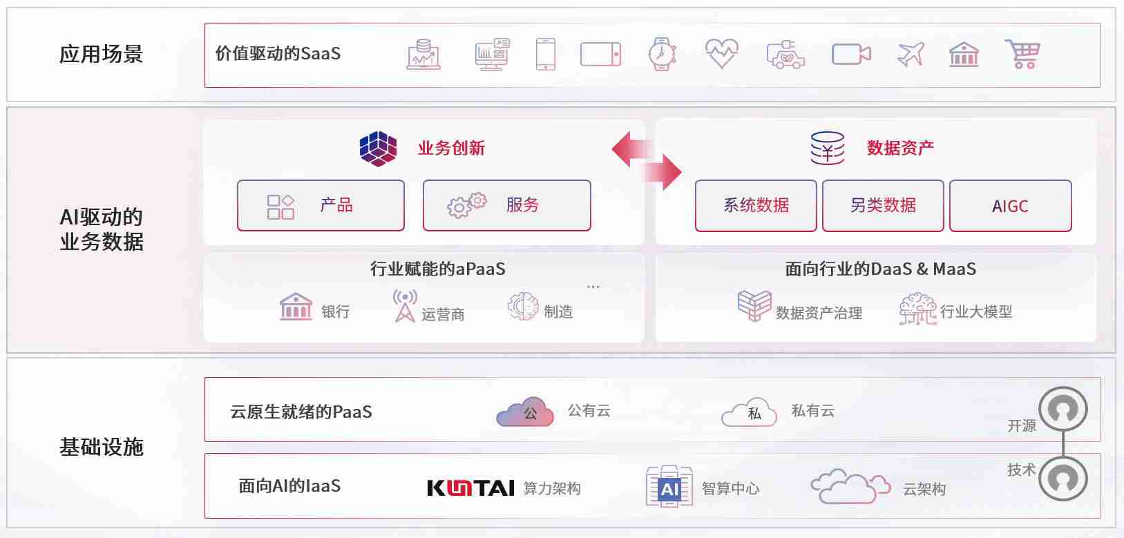 数字时代,,,,围绕企业数字化转型的关键要素,,,酷游官网数码开创性的提出数云融合战略和技术体系框架,,,着力在云原生、、数字原生、、、AI原生和信创产业上架构产品和服务能力,,,,为处在不同数字化转型阶段的快消零售、、汽车、、金融、、、、医疗、、政企、、、教育、、运营商等行业客户提供泛在的敏捷IT能力和融合的数据驱动能力,,,构建跨界融合创新的数字业务场景和新业务模式,,助力企业级客户建立面向未来的核心能力和竞争优势,,,,全面推动社会的数字化、、智能化转型升级。。。